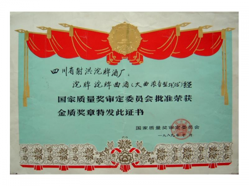 沱牌所获1989年国家名酒金质奖奖状