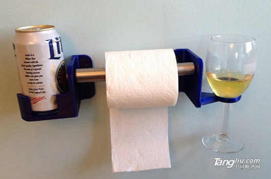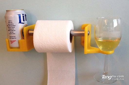 现在出现了一个令人忍俊不禁的小发明——新型厕纸酒架,中间放厕纸,两边可放置酒杯和酒瓶,这样当你如厕时,可以顺手拿起酒杯,随手倒一杯葡萄酒或啤酒,慢慢品尝(不知这时葡萄酒的香气会不会更加的复杂)。